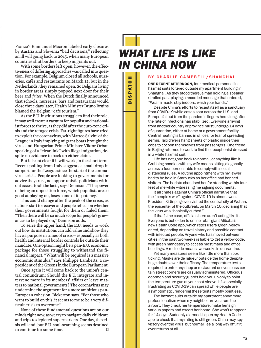 But these spontaneous acts of solidarity stand in stark contrast to what is happening among E.U. nations. The epicenter of the coronavirus moved from China to Europe in the first half of March, and governments turned on one another. The pillars that were meant to hold up the E.U.—the free movement of goods and people—crumpled, as borders went back up and panicked governments stockpiled medical supplies with little regard for their neighbors.